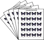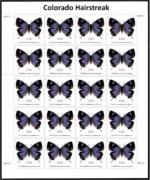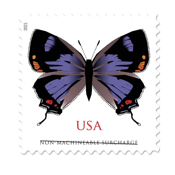 The Colorado hairstreak butterfly graces the eighth non-machineable butterfly stamp for use on irregularly sized envelopes, such as square greeting cards, invitations, or announcements. The stamp art was digitally created using images of preserved butterflies as a starting point. The result is a highly stylized, simplified image of a Colorado hairstreak rather than an exact replica.