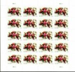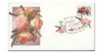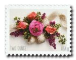 The stamp art features a photograph of a corsage containing a spray of peach roses and a pink ranunculus, accented with deep-pink heather and seeded eucalyptus. A cream-colored lace ribbon entwines the flowers. Garden Corsage is similar in design to the Contemporary Boutonniere Forever stamp, and the two form a natural pair.