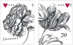 The rose was chosen for the 2015 Weddings Forever stamp because it is a universal symbol of love.??This stamp was issued for use on wedding RSVP cards and thank you notes.??A two-ounce rate Vintage Tulip stamp was released at the same time for use on wedding invitations and greeting cards that require extra postage.