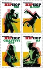 This pane of 20 Stamps features CadeMartin??s photographs depicting fourelements of hip hop: MCing (rapping), bboying (break dancing), DJing, and graffitiart.