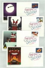 The U.S. Postal Service??s? holiday Stamps for 2012 fea-ture a ??classic?? image of Santa and his reindeer circling around snow-covered rooftops. The scene is composed of four different stamp designs in two rows of two Stamps each. Art director Howard E. Paine worked with illustrations by Paul Rogers in creating these gems.