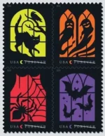 The Postal Service issues four Forever Stamps in time for Halloween. The Spooky Silhouettes Stamps feature digital illustrations with Halloween motifs rendered as black silhouettes in eerily backlit windows.