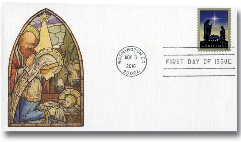 This beautiful stamp was published on the theme of “Christmas 2016”. The Forever stamp shows a classic nativity scene of the Holy Family with the baby Jesus and the shining star of Bethlehem in the background.